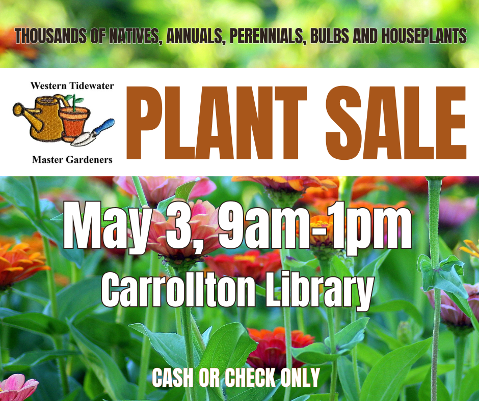The Western Tidewater Master Gardeners will hold a plant sale on Saturday, May 3 from 9:00 a.m. to 1:00 p.m. at the Carrollton Branch of the Blackwater Regional Library. Parking will be at Carrollton Elementary School next to the library.
