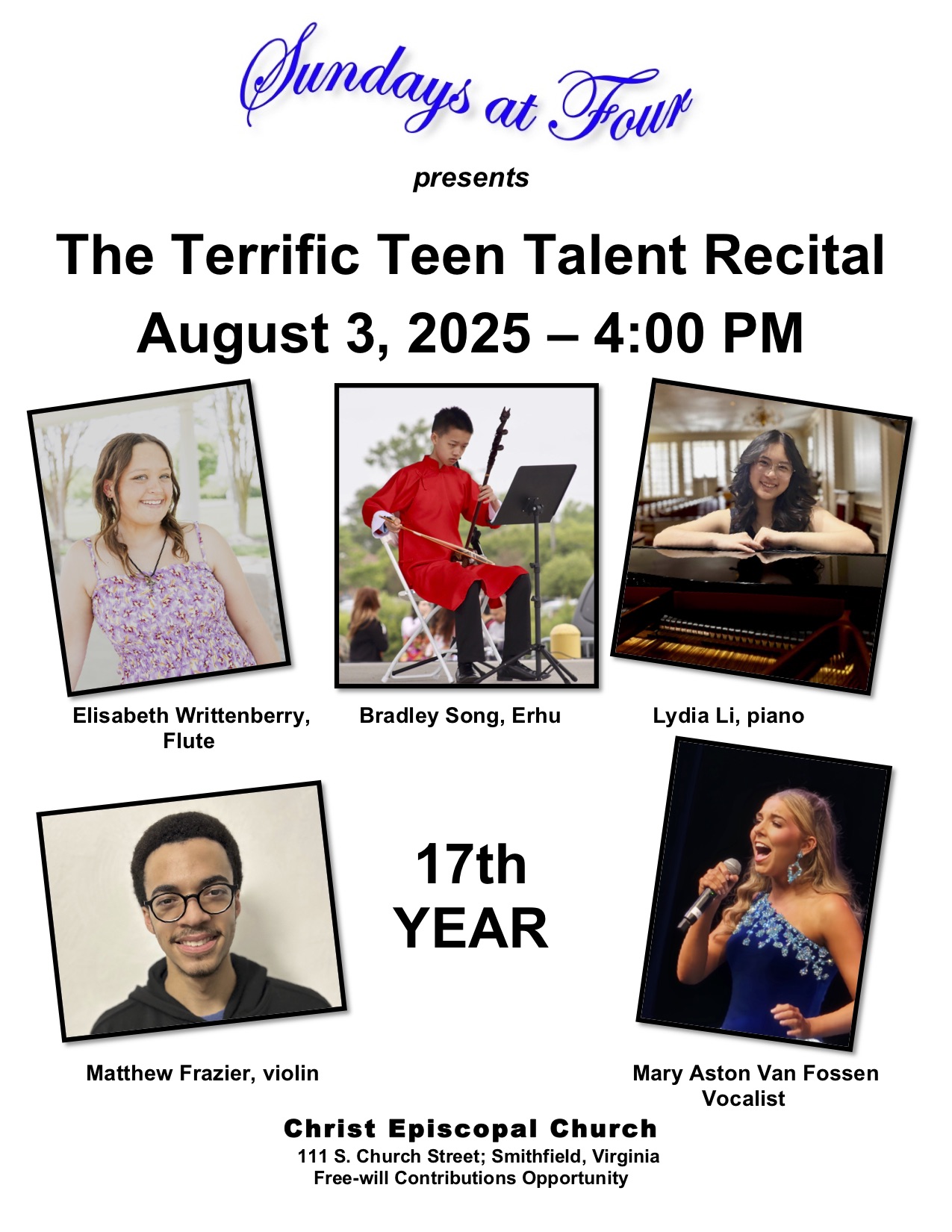 Sunday, August 3rd at 4:00 PM, Smithfield’s Chamber Concert Series will present its annual Terrific Teen Talent Recital. Five outstanding young musicians from Hampton Roads will delight the audience during this seventeenth recital year. Featured are the Chinese Erhu, piano, flute, violin and voice.