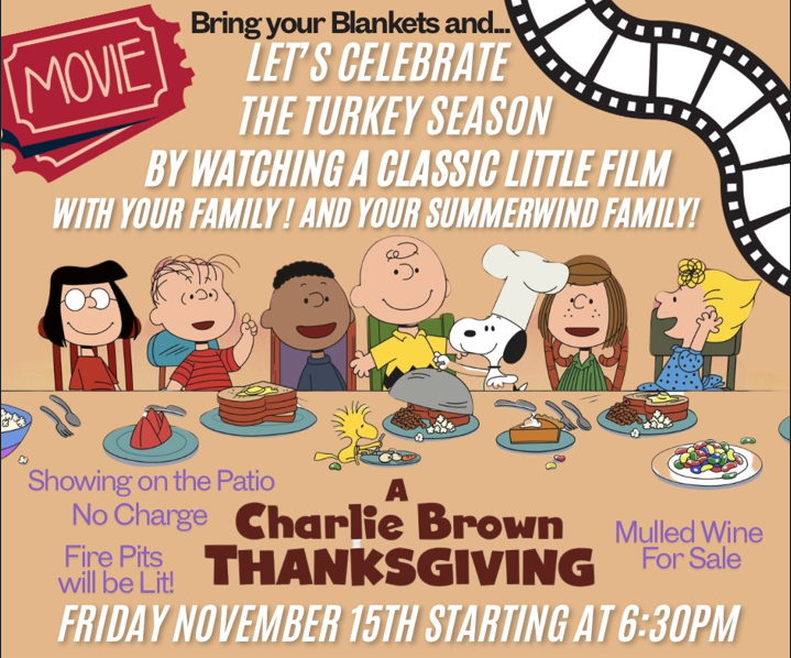Celebrate the holiday of gratitude and thankfulness. Enjoy the family classic "A Charlie Brown Thanksgiving" at the winery. Bring a blanket or chair, some seating is available. Free admission, no cover charge. Have dinner or charcuterie at the winery and enjoy a wine flight or Meg's Sangria.