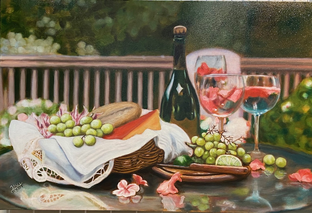 Dining nourishes the soul as well as the body. Your eyes feast on the luscious colors of food, beverages and flowers, the inviting textures of china and cloth. You consume the glow of candles or sun and the sparkle of light on glassware, reflected in silver and brass. Can your palette tempt the palate with a piece that centers around the dining table?